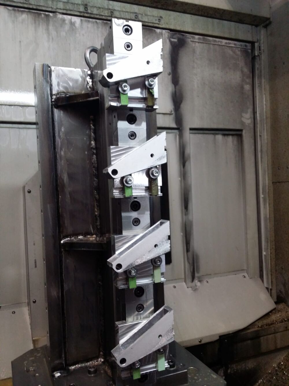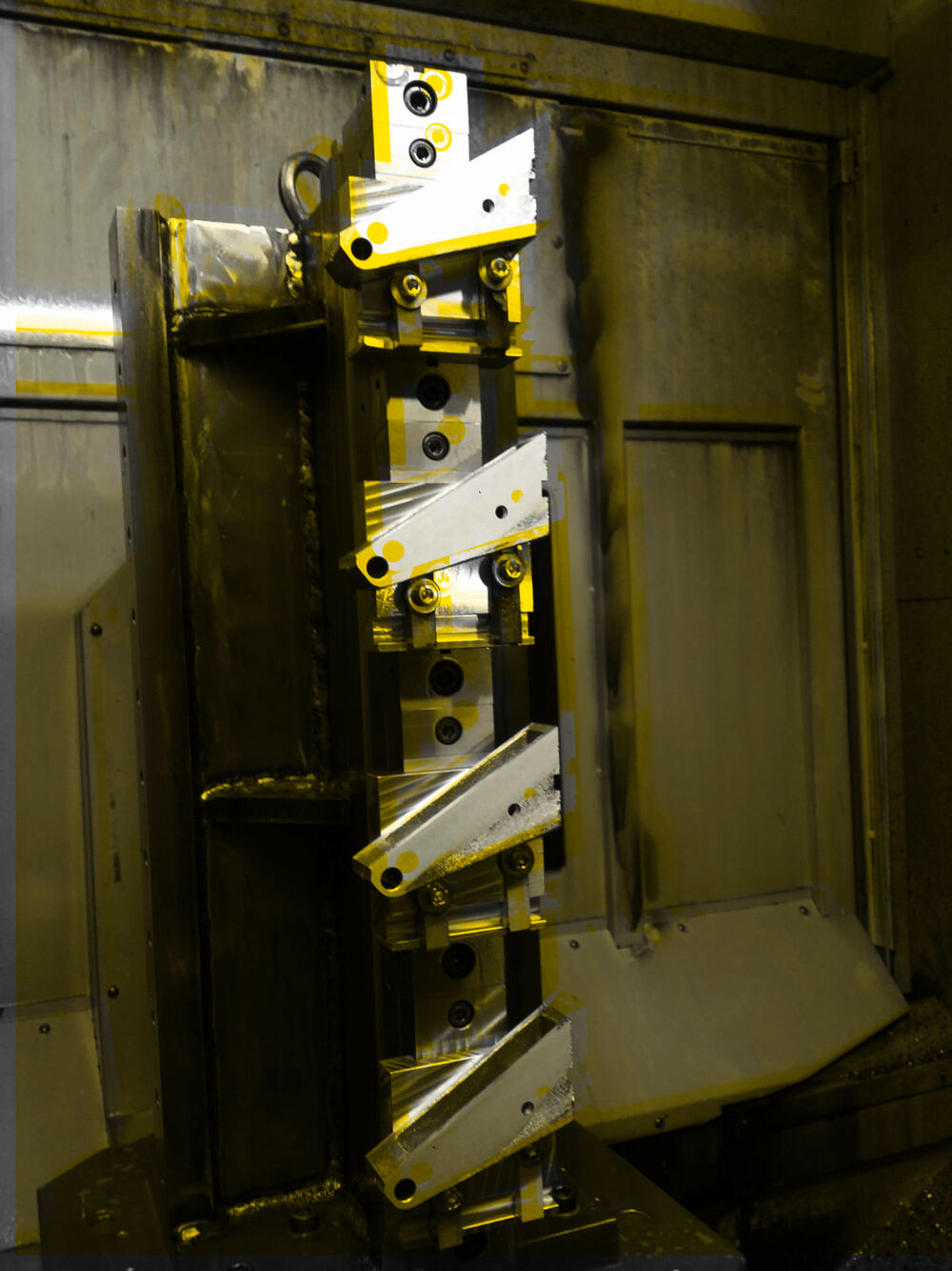 Foto oben: Mehrfachaufspannung von Stahlteilen auf Turm in Horizontalfräsmaschine